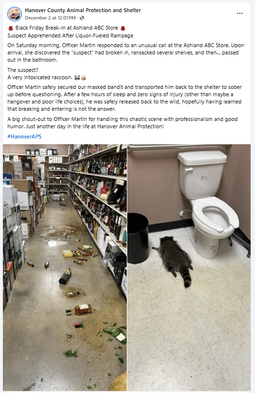A rowdy raccoon breaks into a liquor store, gets drunk, passes out in the bathroom, and the liquor store it happened to turns it into PR gold.